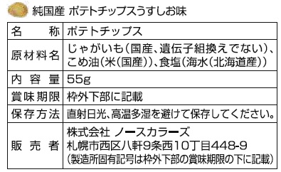 - じゃがいも(国産、遺伝子組換えでない)、こめ油(米(国産))、食塩(海水(北海道産))
