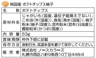 じゃがいも(国産、遺伝子組換えでない)、こめ油(米(国産))、食塩(海水(国産))、柚子粉末(柚子(国産))、昆布粉末(昆布(日高産))、鰹節粉末(かつお(国産))