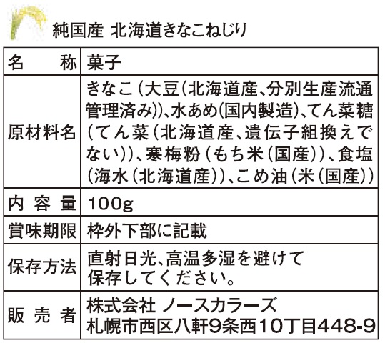 - きなこ(大豆(北海道産、分別生産流通管理済み))、水あめ(国内製造)、てん菜糖(てん菜(北海道産、遺伝子組換えでない))、寒梅粉(もち米(国産))、食塩(海水(北海道産))、こめ油(米(国産))